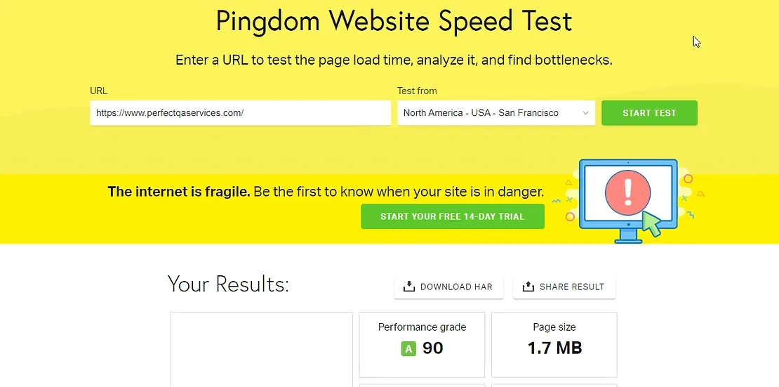 The Pingdom tool lets you check whether your webpage is fast or slow. You can check your file and folder sizes, page size, loading time, performance grade, and other details.