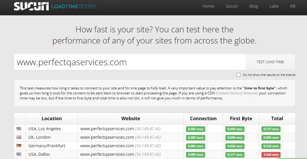 Sucuri load time test cross-checks how long it takes to connect your site and to load a web page completely. You can easily and effortlessly check the performance of any site from anywhere with such testing.