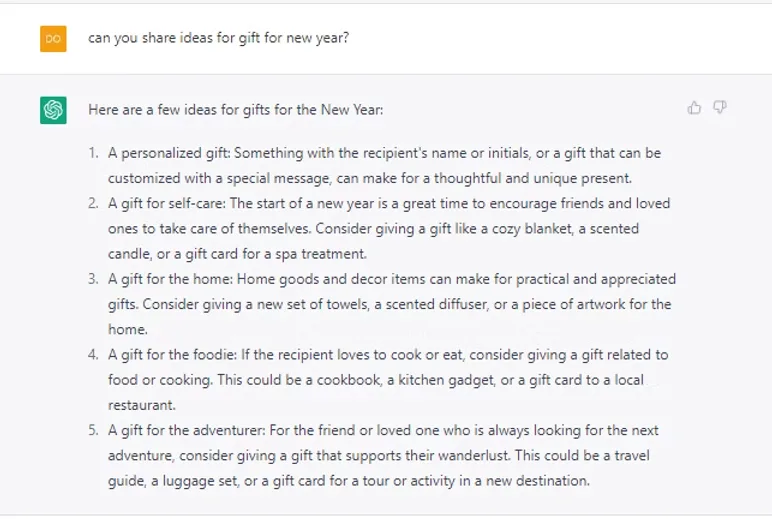 It is rather interesting how adaptable they are when answering questions. Another illustration: With New year quickly coming, ChatGPT was asked for ideas for gifts. They recommended the following: